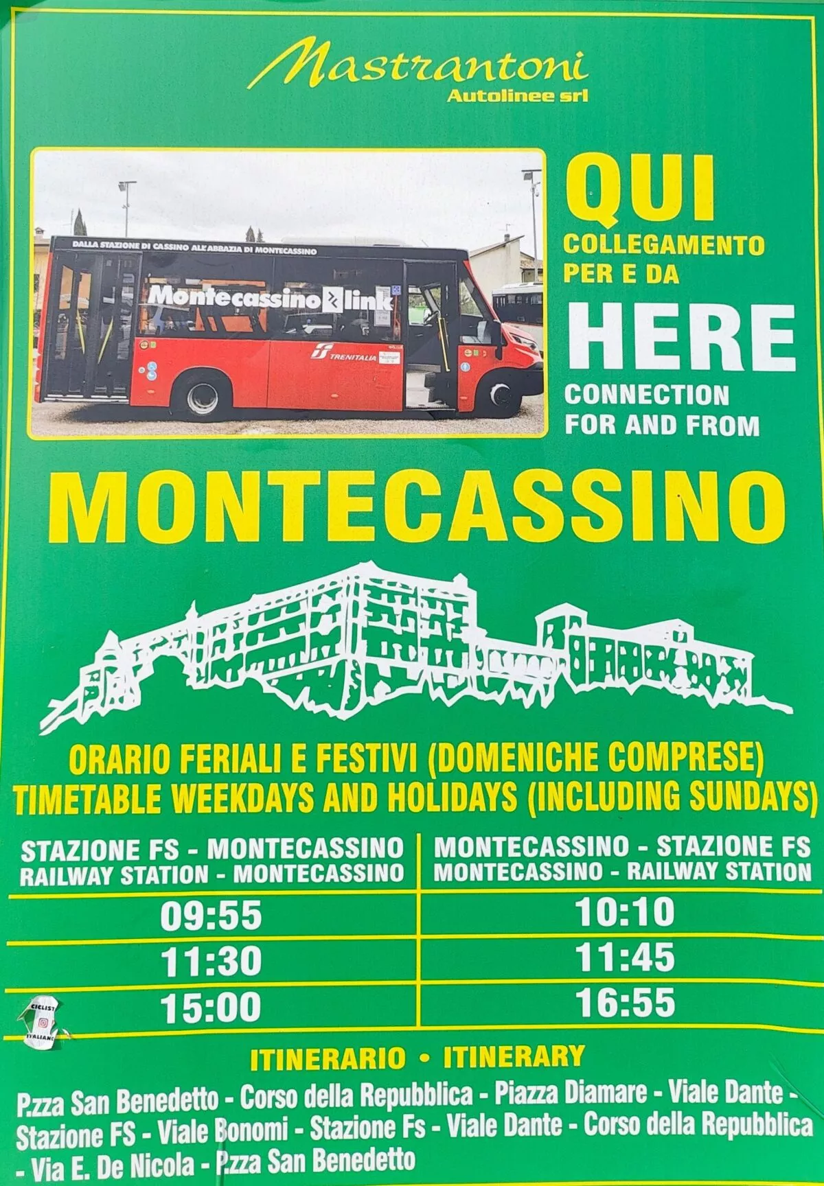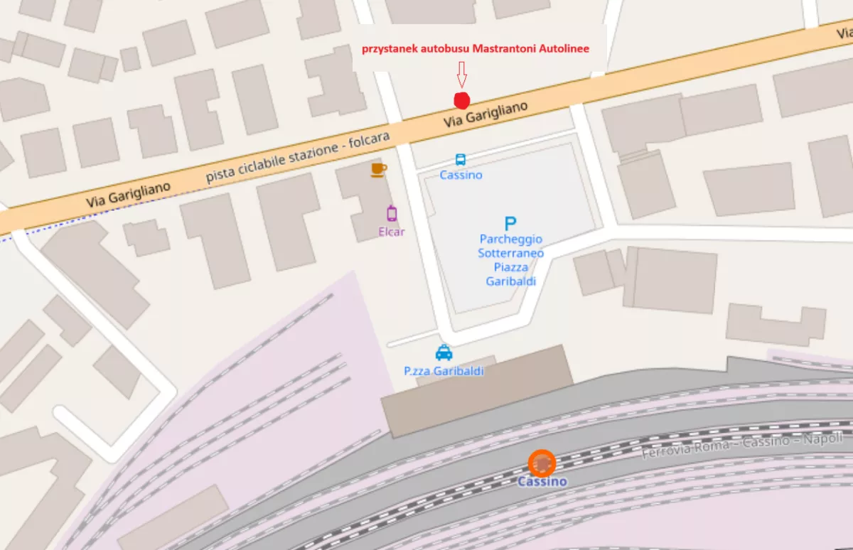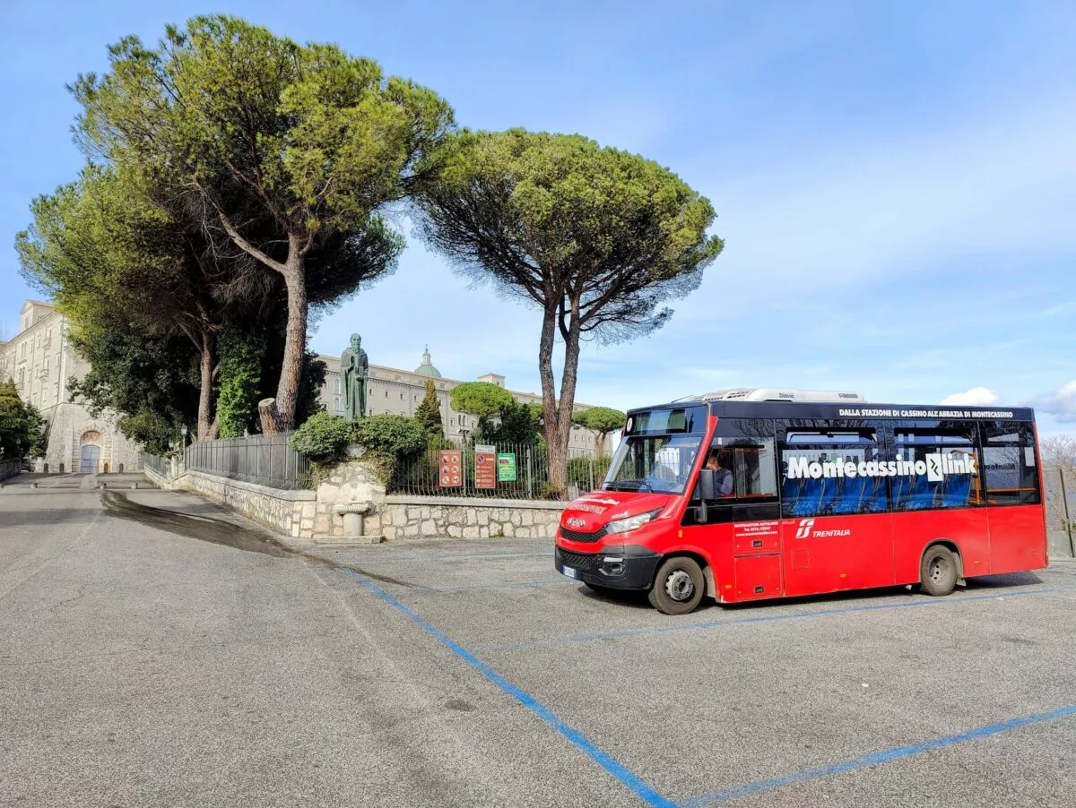 Autobus MASTRANTONI wyjeżdża do klasztoru tylko trzy dziennie z pobliża dworca kolejowego w Cassino o godzinach: 9.55, 11.30, 15.00; wraca z klasztoru Montecassino w godzinach: 10.10, 11.45, 16.55