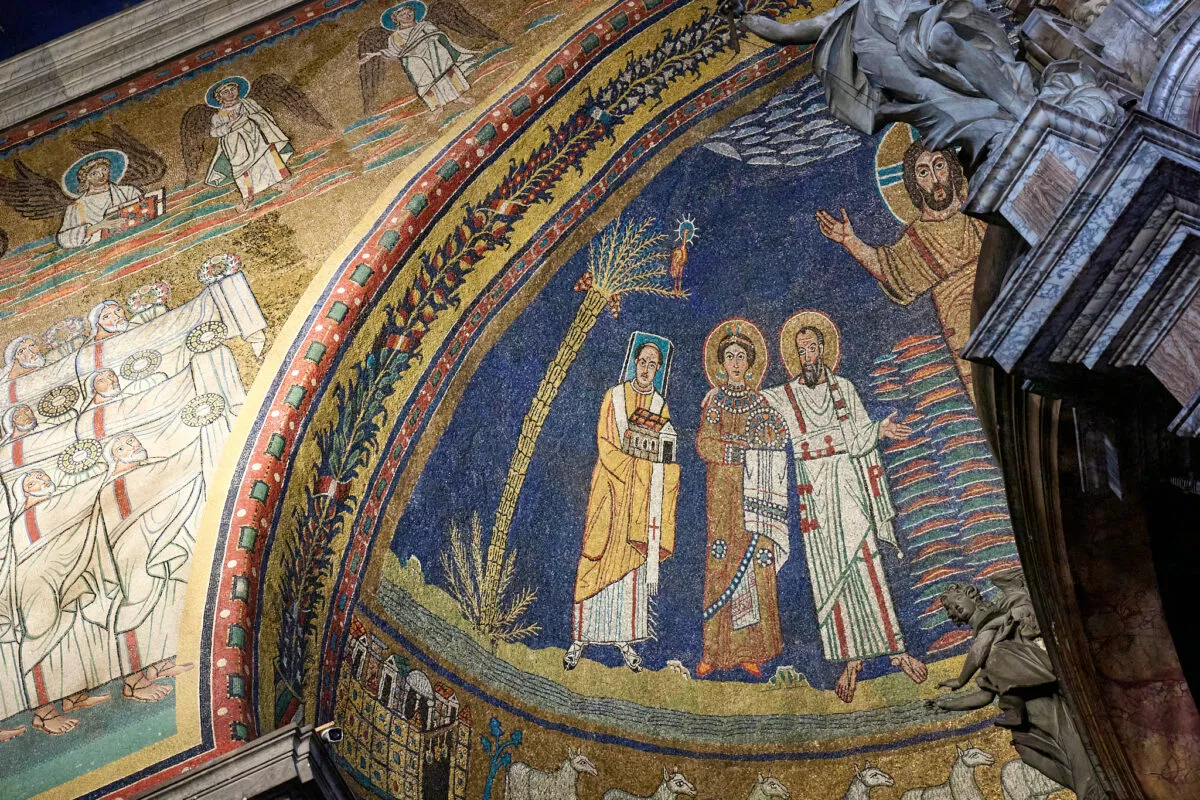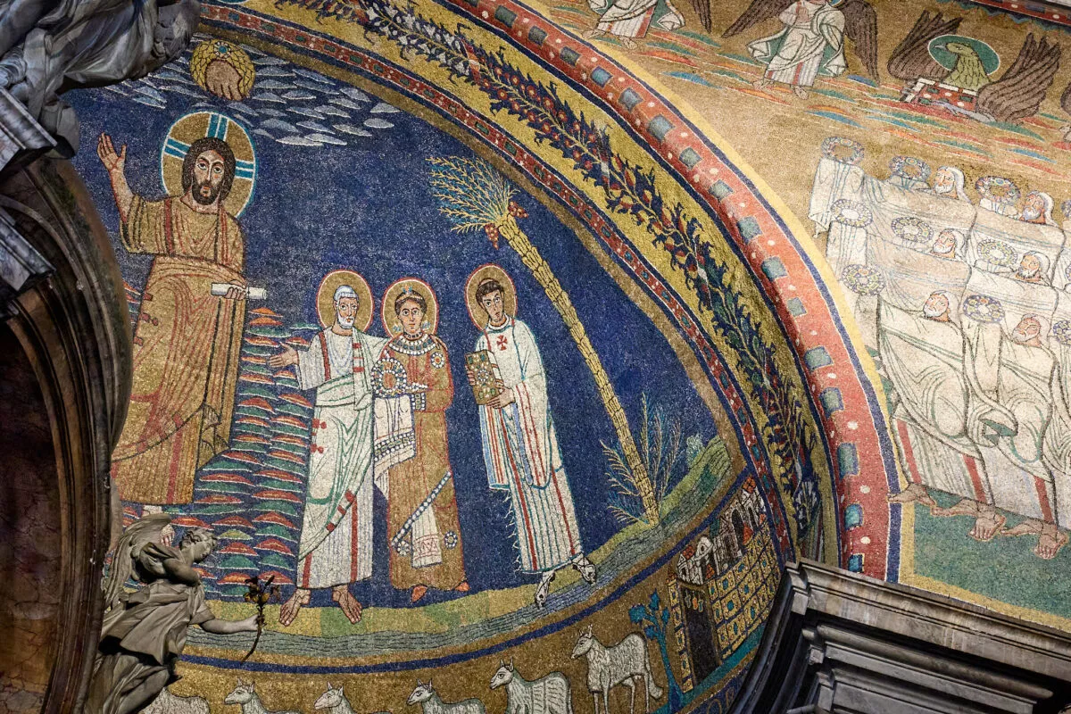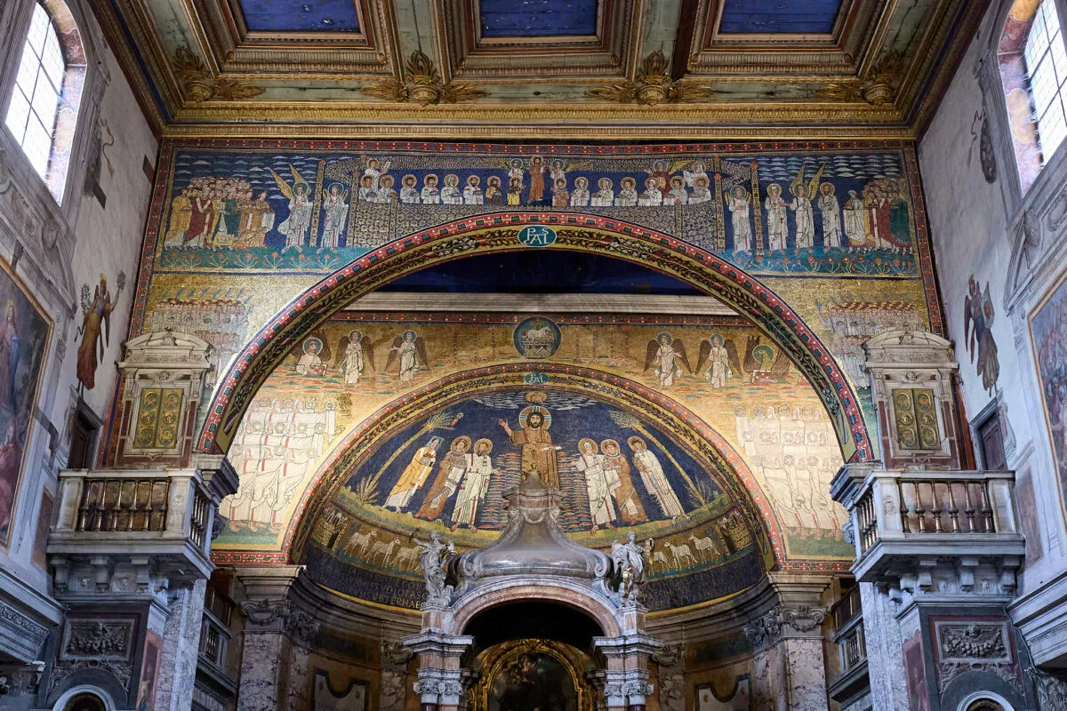 Najbardziej imponujące mozaiki znajdują się w absydzie, za głównym ołtarzem. Przedstawiają one Chrystusa Zmartwychwstałego zstępującego z nieba w otoczeniu świętych sióstr Praksedy i Pudencjany, św. Piotra oraz papieża Paschalisa I, fundatora świątyni, prezentującego jej model.