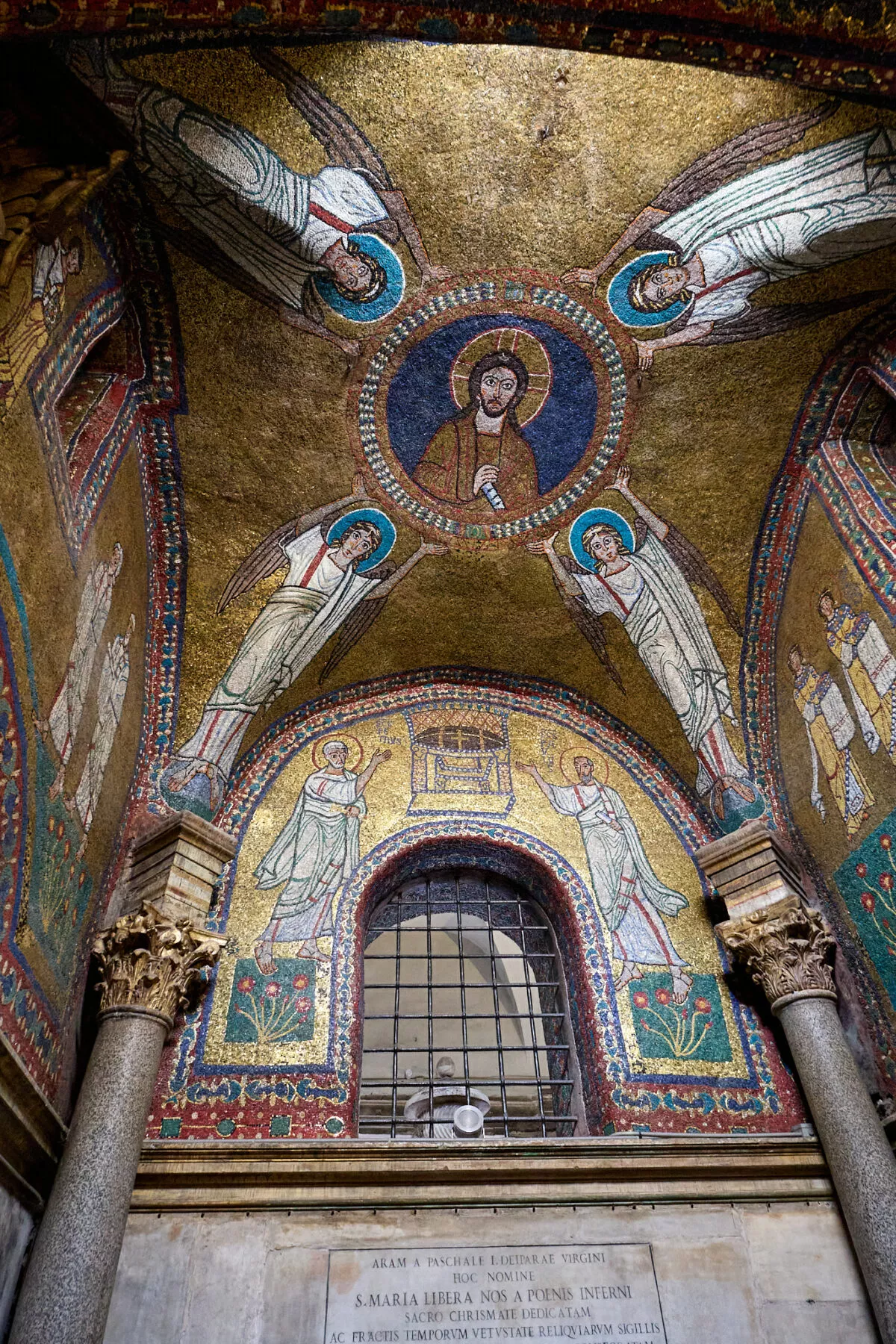 Wchodząc do jej małego wnętrza, trudno powstrzymać zachwyt nad wrażeniem całości, w której złoto tesser mozaikowych olśniewa i oszałamia. Prawdopodobnie papież Paschalis I kazał zbudować tę kaplicę jako mauzoleum dla swojej ukochanej matki Teodory, wtedy jeszcze żyjącej. Mozaiki przedstawiają kilka postaci ludzkich: przede wszystkim Chrystusa Prawodawcę między czterema aniołami, Madonnę z Dzieciątkiem na kolanach, św. Piotra i św. Pawła przy tronie Paruzji oraz siostry Praksedę i Pudencjanę razem z episkopą Teodorą (episkopa, to żona lub matka biskupa), przedstawioną z kwadratowym nimbem żywych.