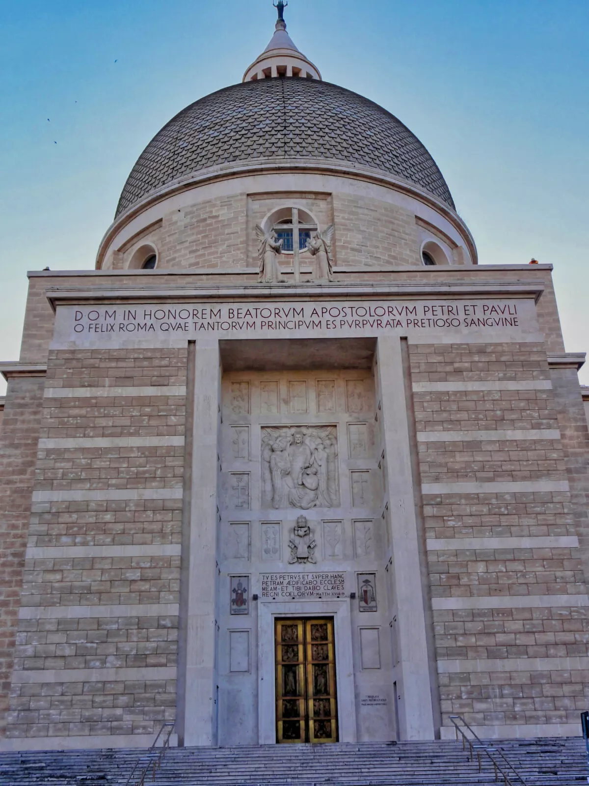 Budynek, zaprojektowany przez architekta Arnaldo Foschiniego w 1938 roku, na planie krzyża greckiego, charakteryzuje się żelbetową konstrukcją zwieńczoną dużą kopułą o średnicy 31 metrów. Marmur z włoskiej miejscowości Vicenza i rzymski trawertyn pokrywają ściany bazyliki na zewnątrz. Kolorowe malowidła, witraże i kolorowa marmurowa podłoga kontrastują z białymi ścianami wewnątrz. Dwa kolosalne posągi świętego Piotra i świętego Pawła, ustawione na placu przed budynkiem od początku 1942 roku, są dwoma najbardziej reprezentacyjnymi elementami bazyliki.