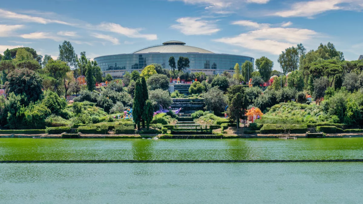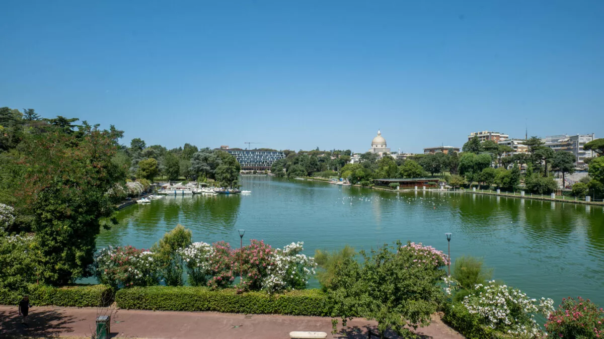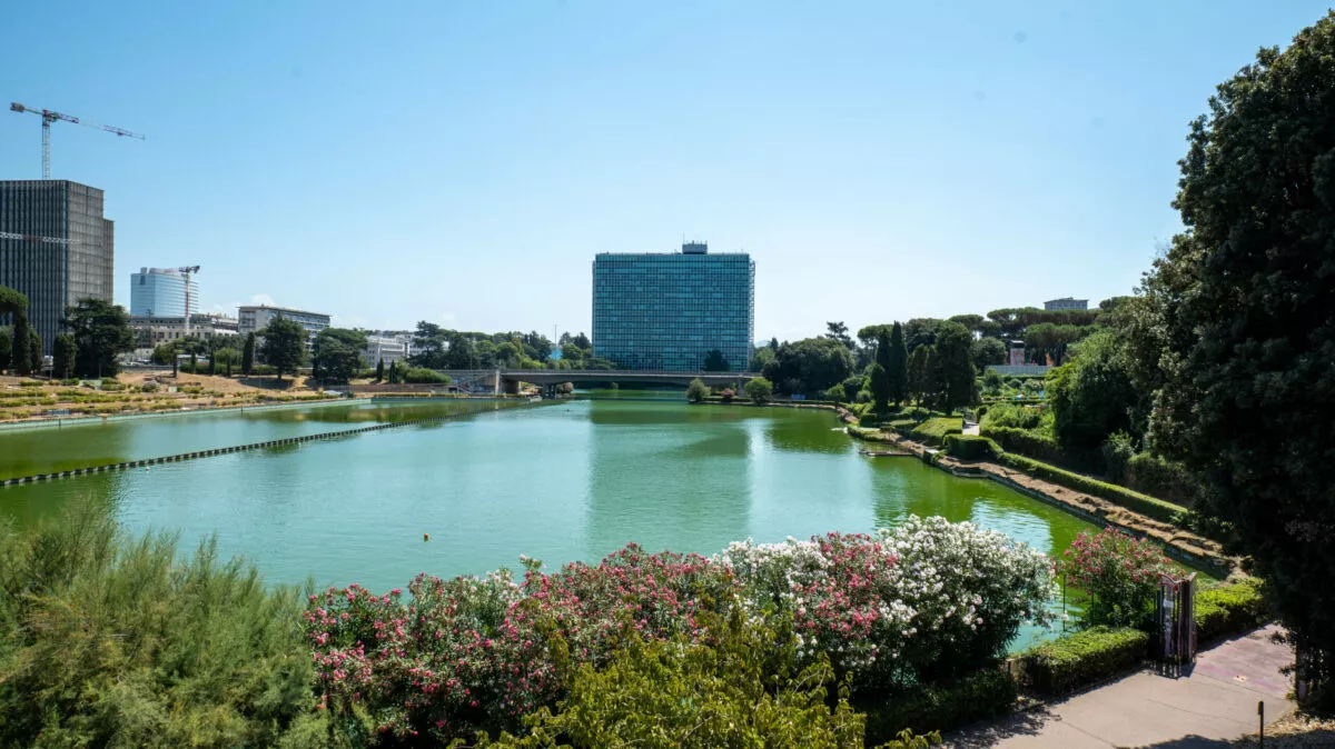 Jeśli dotrzecie do EUR-u metrem B (stacje EUR PALASPORT i EUR FERMI), to pierwszą atrakcją na którą traficie będzie rozległy park miejski ze sztucznym jeziorkiem „Laghetto” – taki mini Central Park dzielnicy. Miejsce jest bardzo urokliwe, szczególnie jego południowa strona, z bogatą w gatunki szatą roślinną (aleja japońska wysadzona wiśniami), wodospadami i widokami na dzielnicę.