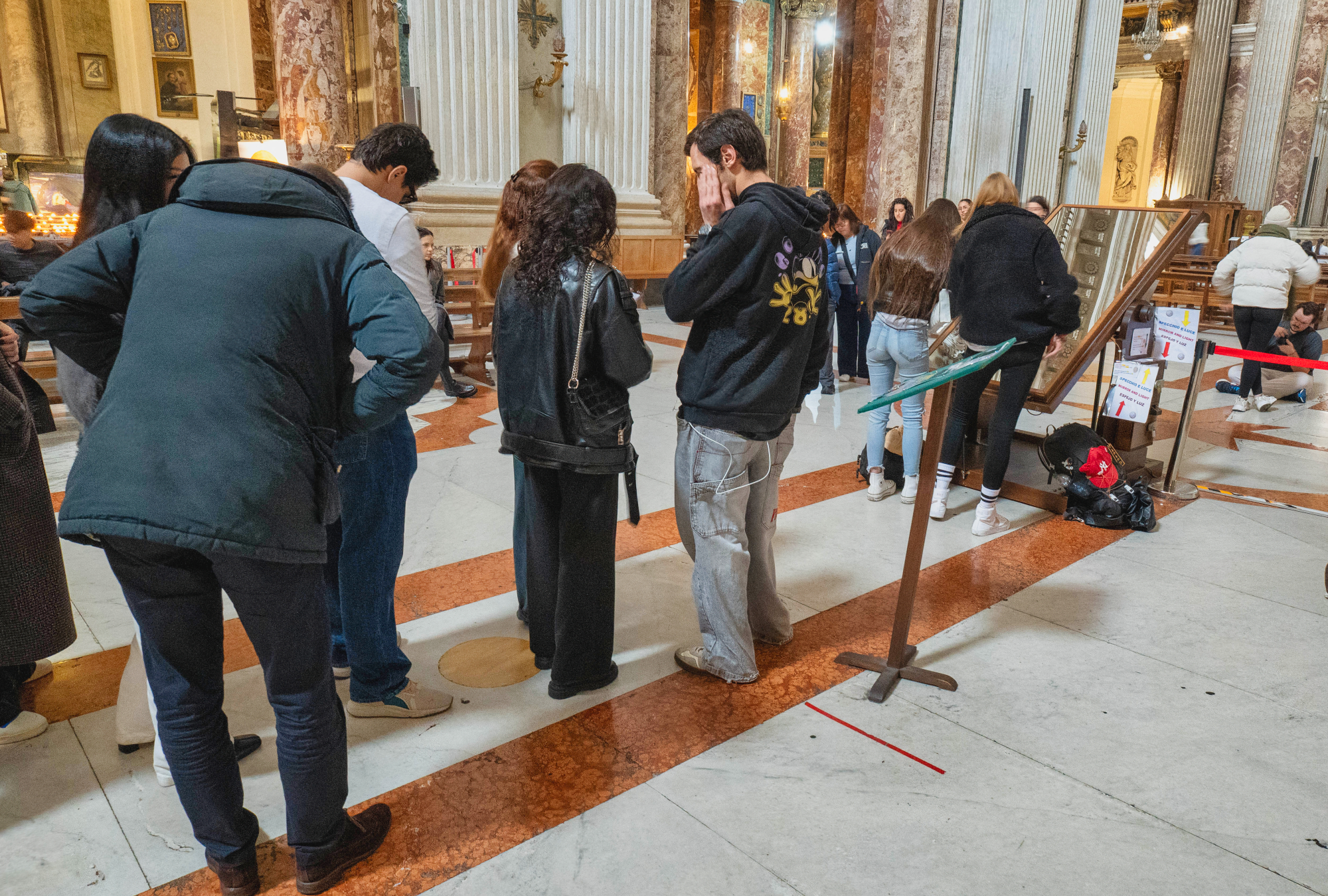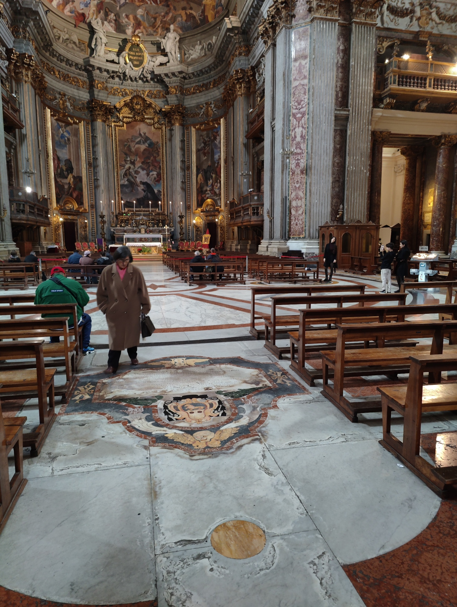 Pro-tip: wspomniane wcześniej lustro ustawiane jest na posadzce kościoła w centrum głównej nawy. Stoi w centrum, ale nie dokładnie w tak zwanym punkcie fokalnym, z którego należy oglądać sufit, by zobaczyć doskonałą iluzję 3D (oglądany z innych miejsc, sufit traci swoje idealne proporcje). Punkt fokalny zaznaczony jest na posadzce małym żółtym marmurowym kręgiem w centrum nawy. Zazwyczaj depczą po nim nieświadomi niczego turyści stojący w kolejce do lustra.