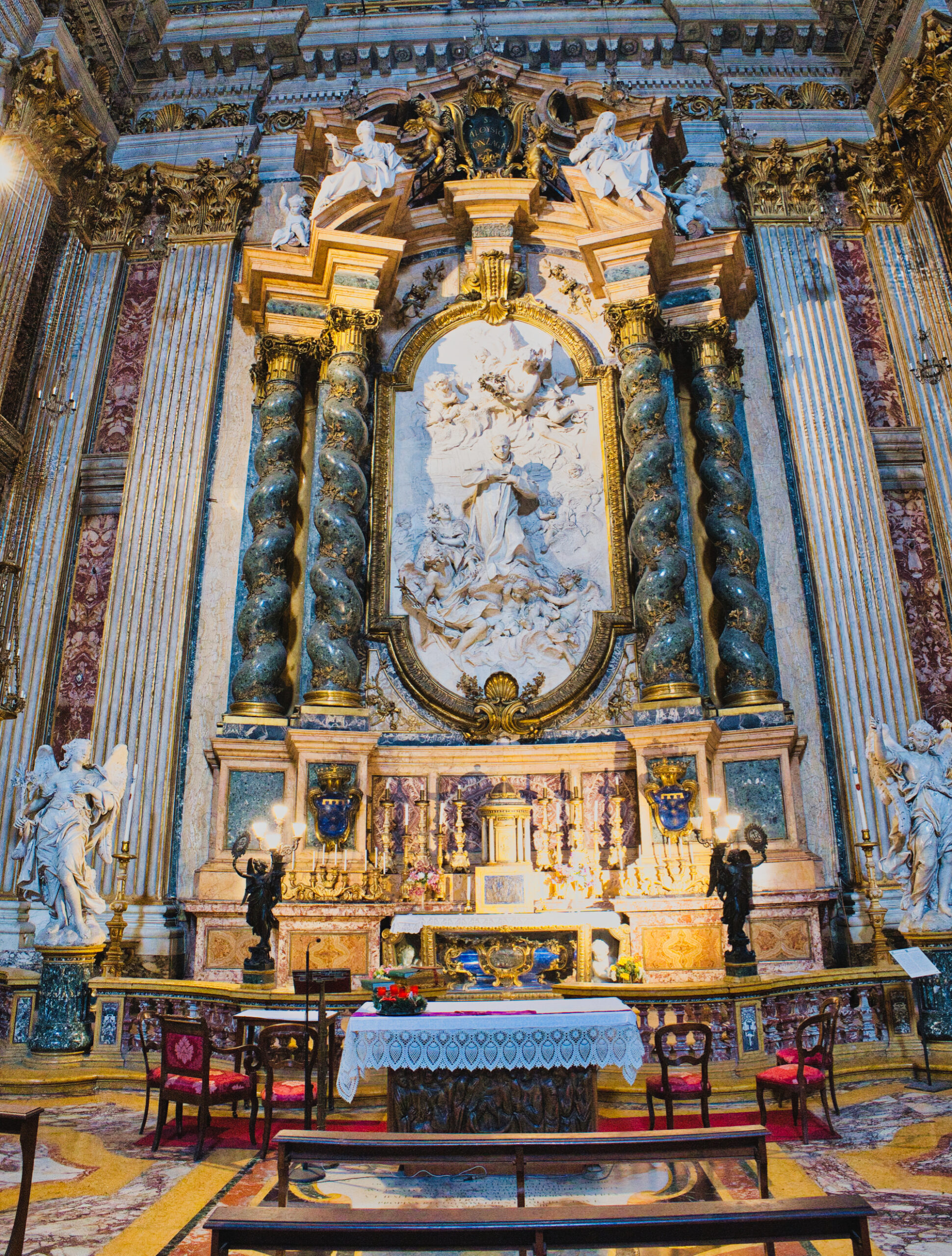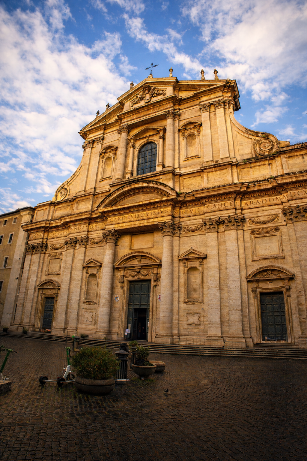 Już od wejścia na plac przed świątynią poczujecie się, jakby ktoś otworzył przed wami bramy teatralnego spektaklu. Dwukondygnacyjna fasada projektu Grassiego promieniuje harmonią i doskonałymi proporcjami. Na pierwszy rzut oka prosta, ale z każdym krokiem odkrywa nowe detale: wyszukane pilastry, medaliony i napisy, które podkreślają chwałę jezuitów. Jeśli zwrócicie uwagę na detale, zauważycie delikatne ornamenty, które symbolizują jedność wiary i nauki, dwóch filarów zakonu jezuitów.