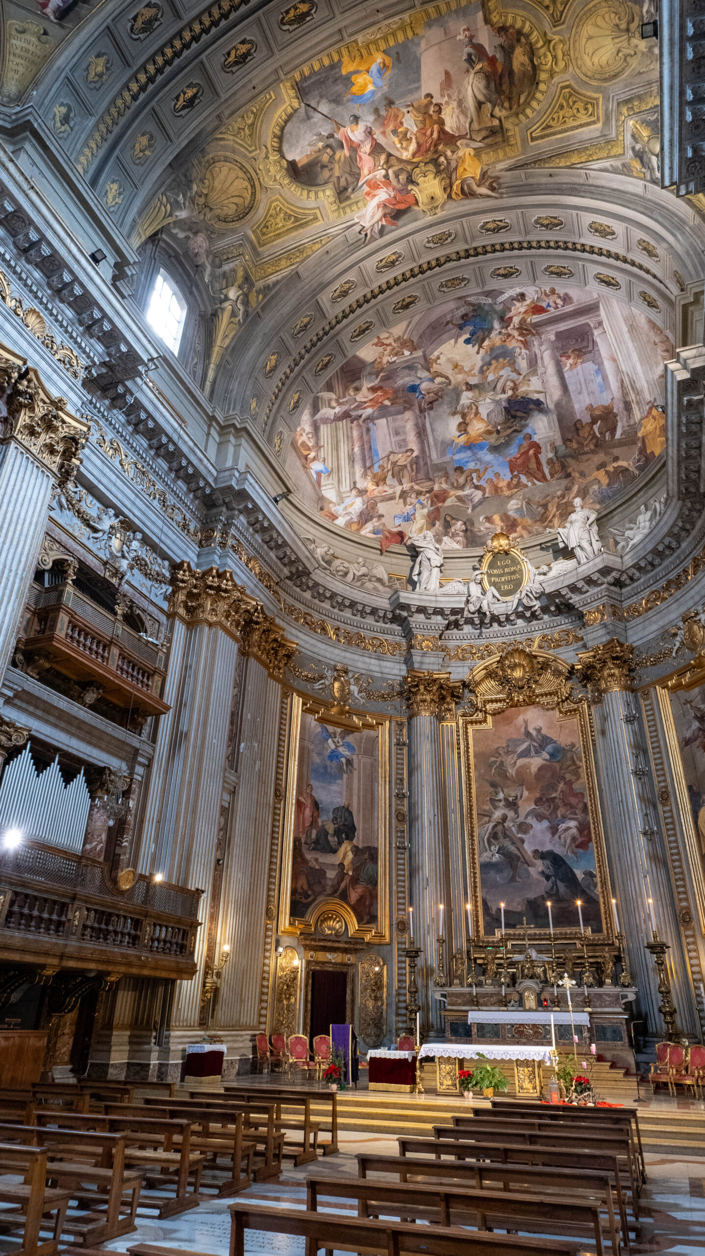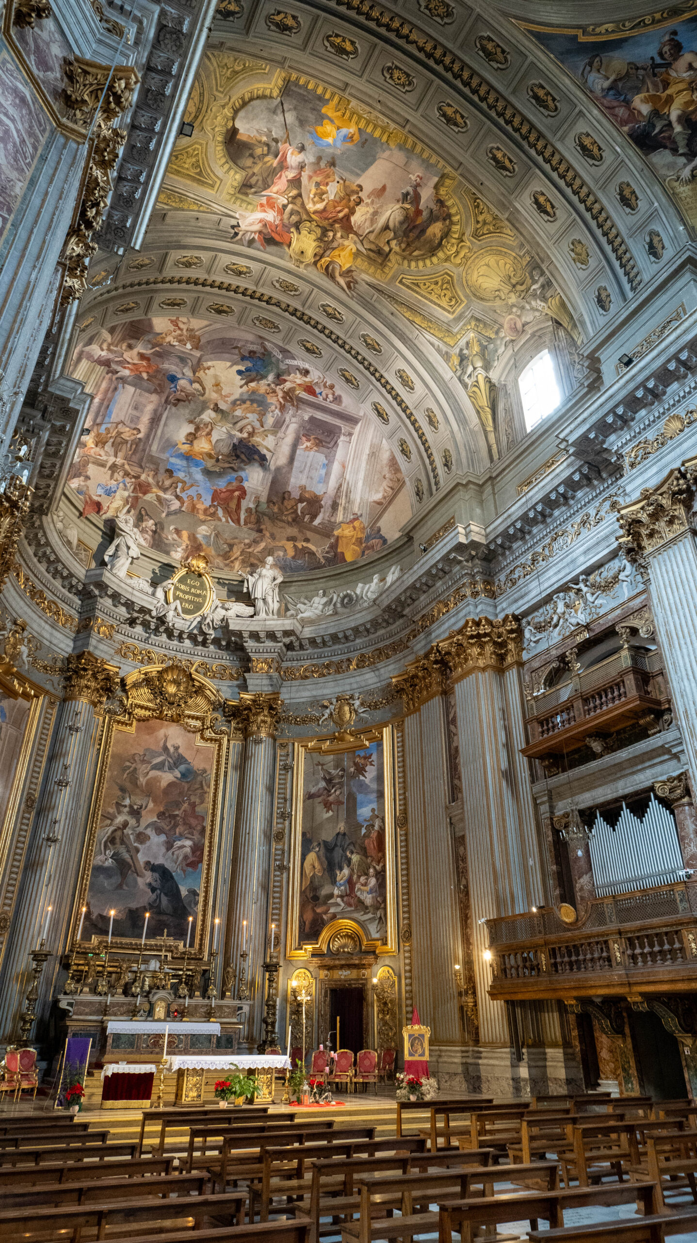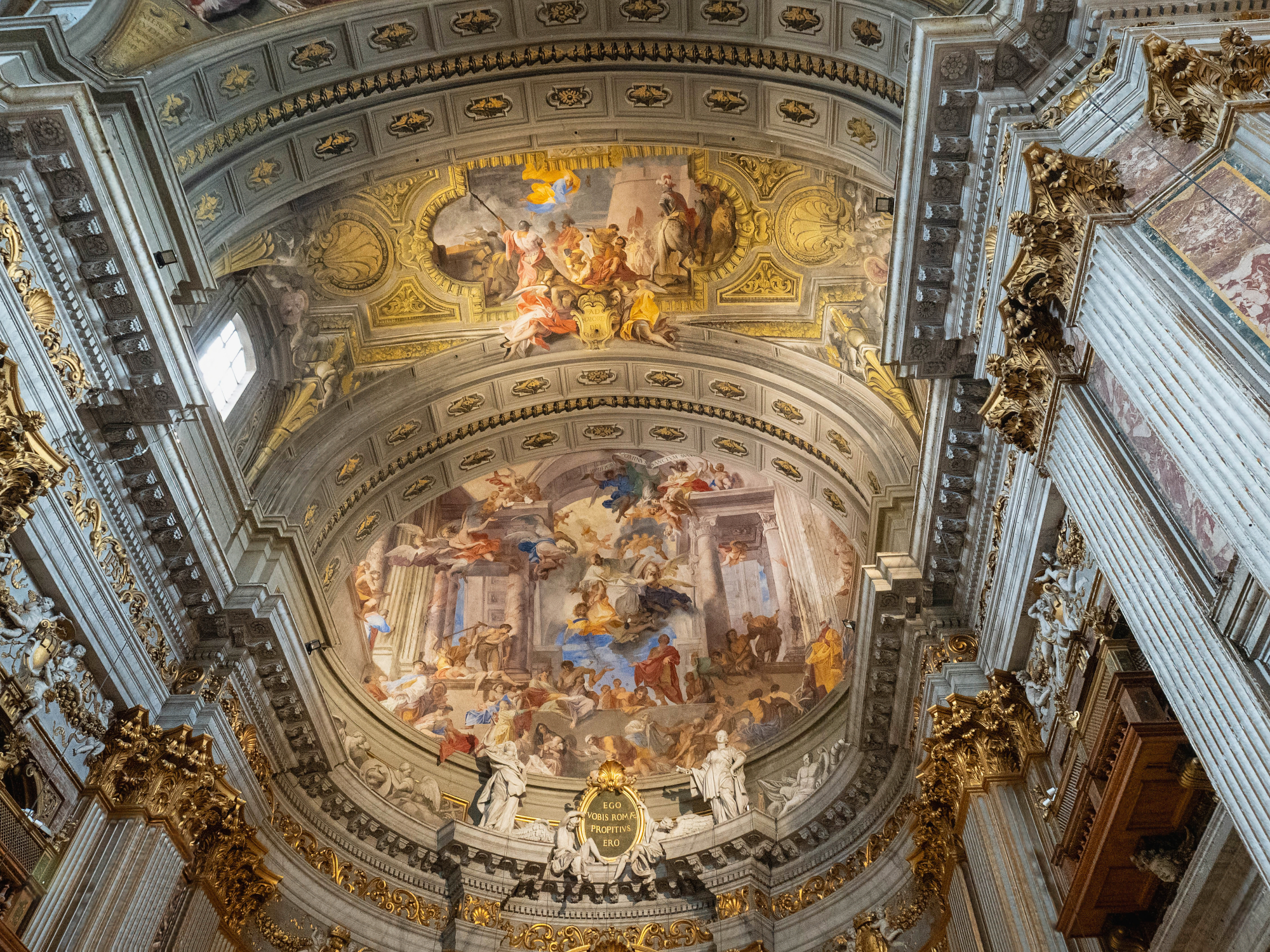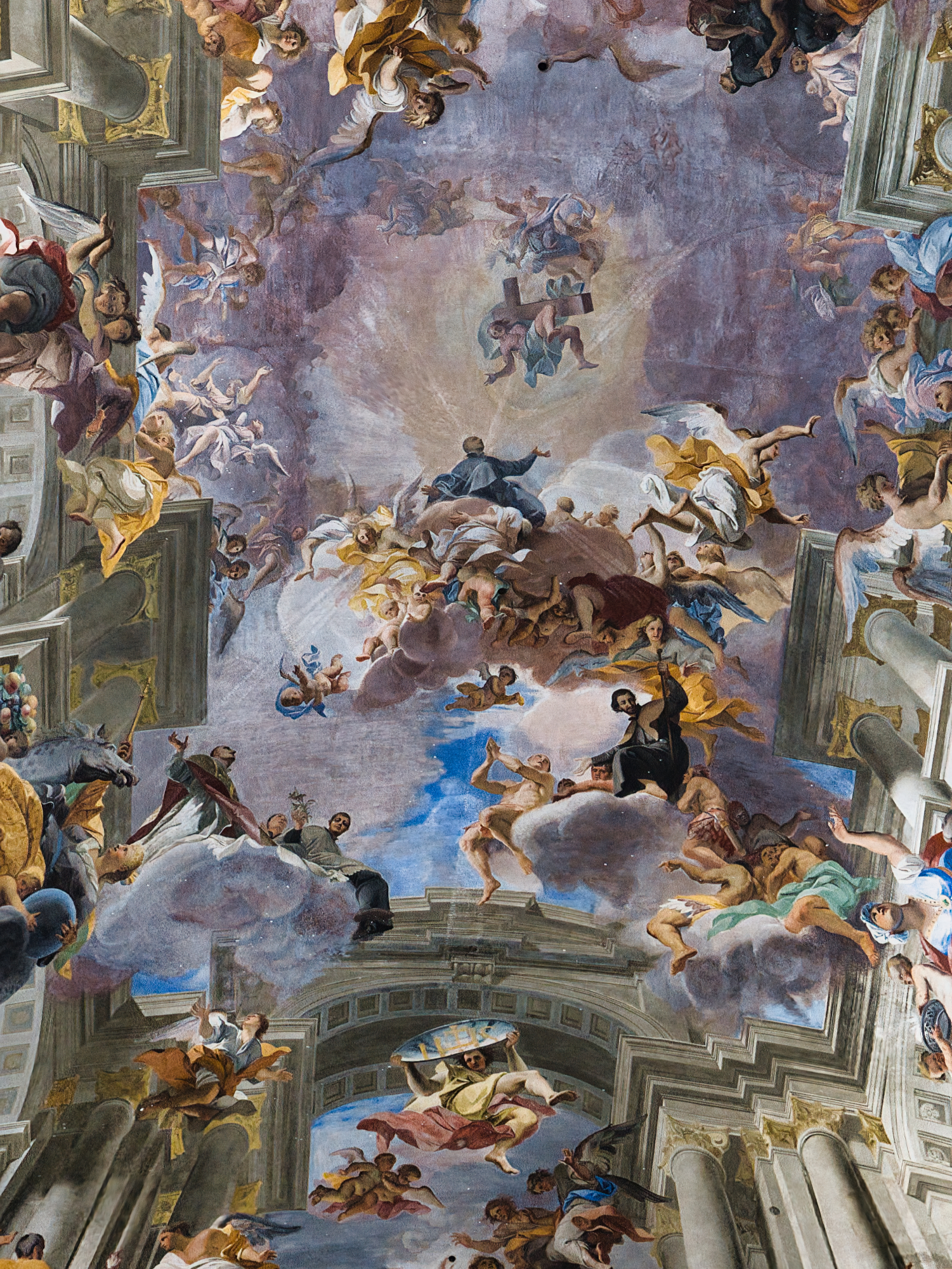 Sufit jest tak spektakularny, że można spędzić długie minuty, podziwiając każdy szczegół, od dynamicznych postaci po subtelne gry światła i cienia. Skorzystajcie z ławek kościelnych ustawionych w ten sposób, by umożliwić wygodną kontemplację tego teatralnego sklepienia lub — jak to robi wielu turystów — stańcie w kolejce do lustra, w którym bez zadzierania głowy, możecie zobaczyć i sfotografować to niezwykłe sklepienie.