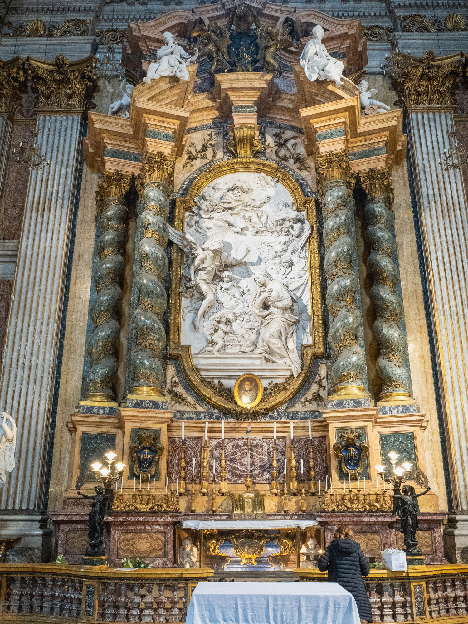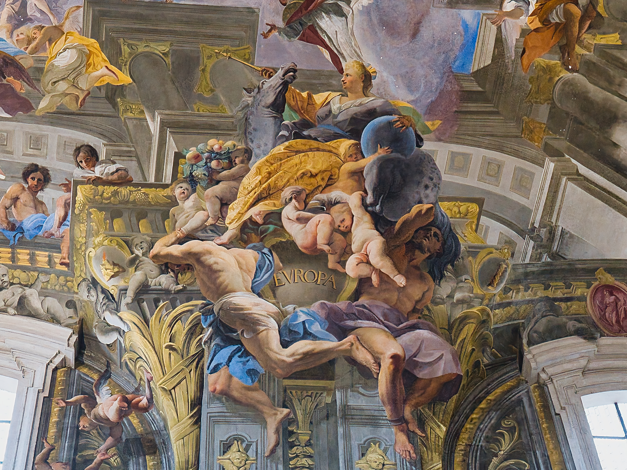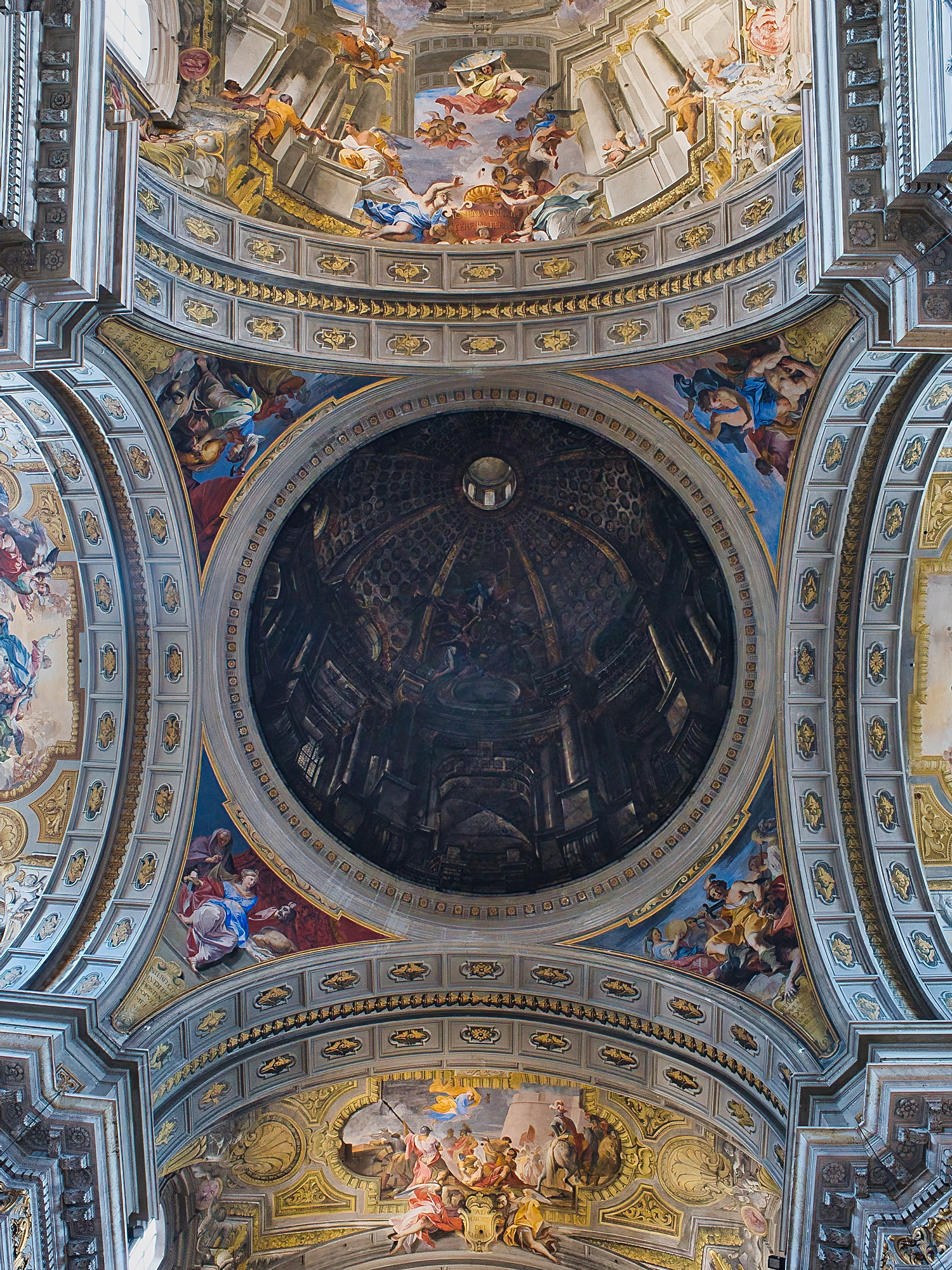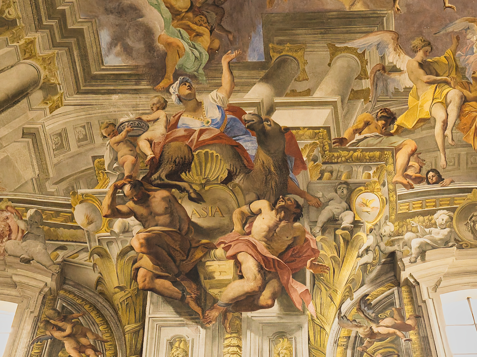 Sufit jest tak spektakularny, że można spędzić długie minuty, podziwiając każdy szczegół, od dynamicznych postaci po subtelne gry światła i cienia. Skorzystajcie z ławek kościelnych ustawionych w ten sposób, by umożliwić wygodną kontemplację tego teatralnego sklepienia lub — jak to robi wielu turystów — stańcie w kolejce do lustra, w którym bez zadzierania głowy, możecie zobaczyć i sfotografować to niezwykłe sklepienie.