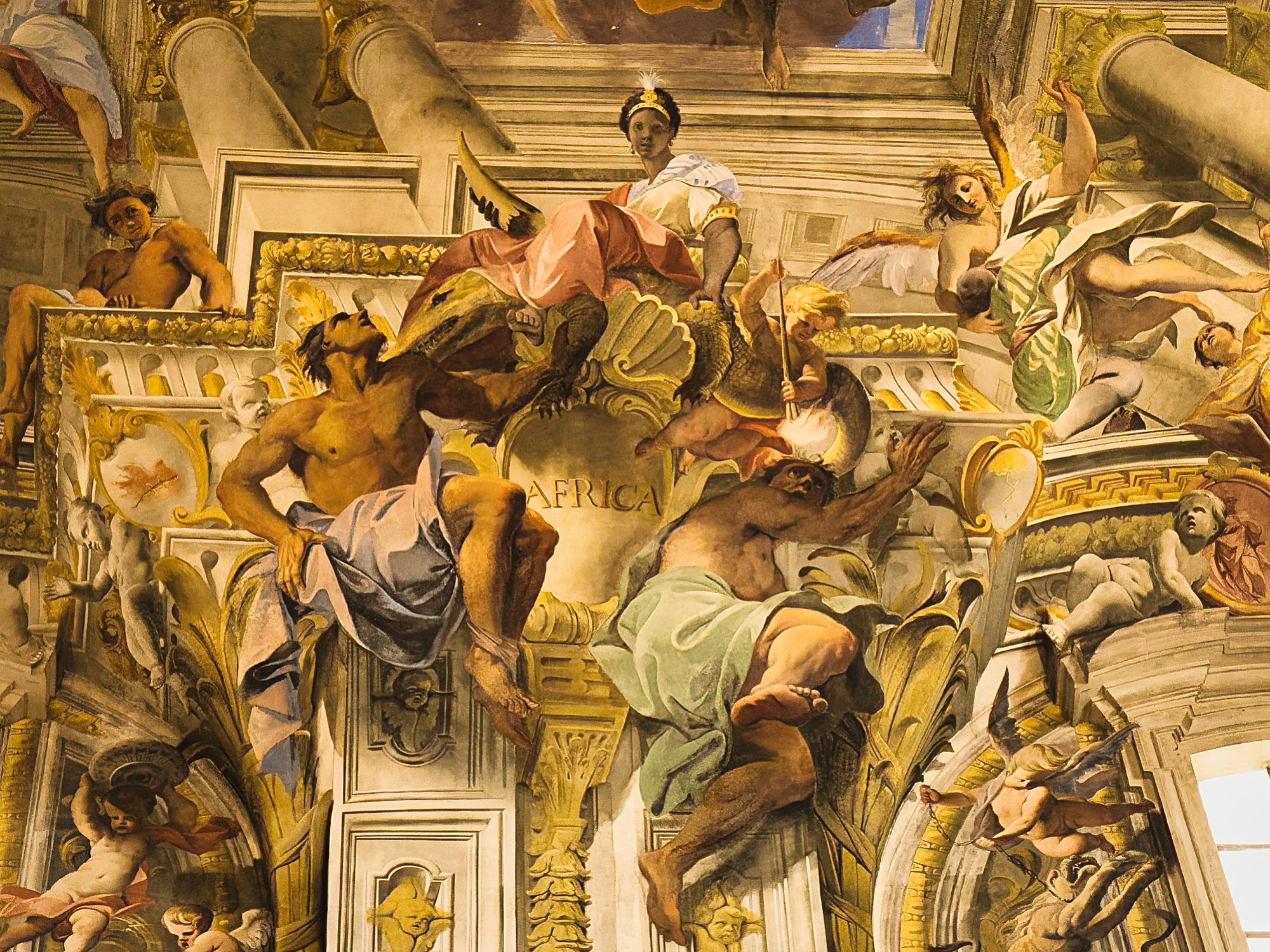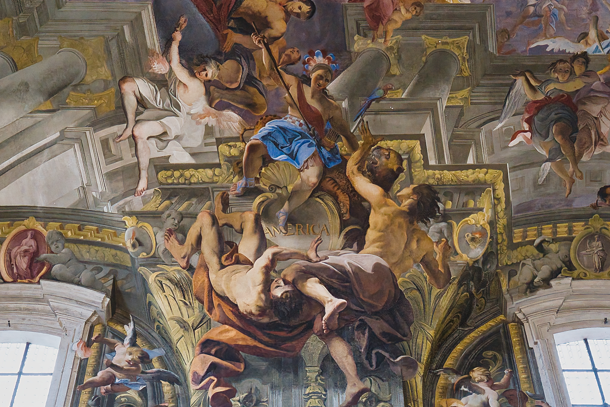 Nie da się ukryć – sufit jest prawdziwą gwiazdą tego kościoła. Andrea Pozzo, jezuita i mistrz iluzji optycznej, w 1694 roku stworzył fresk 3D, który wprawia widzów w osłupienie. Wykorzystując zasady perspektywy geometrycznej oraz zasady anamorfozy (technika polegająca na tworzeniu zniekształconego obrazu, który nabiera właściwych proporcji z określonego punktu widzenia), Pozzo przedstawia apoteozę św. Ignacego i tryumf jezuitów na czterech kontynentach – Europie, Azji, Afryce i Ameryce.